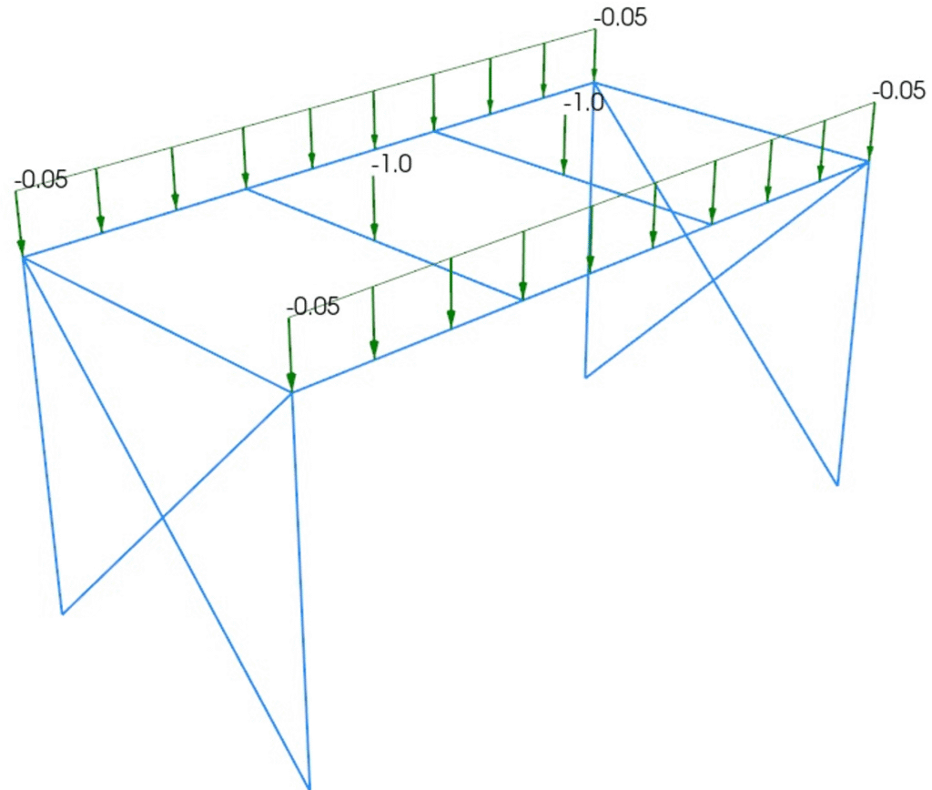 O XStrudes exibe graficamente todos os carregamentos (nodais, concentrados e distribuídos) sobre o modelo 3D da estrutura, auxiliando o usuário a confirmar que todas as cargas foram aplicadas corretamente e nas posições desejadas.